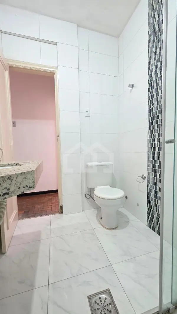 O banheiro social conta com box em vidro temperado, proporcionando modernidade e praticidade.